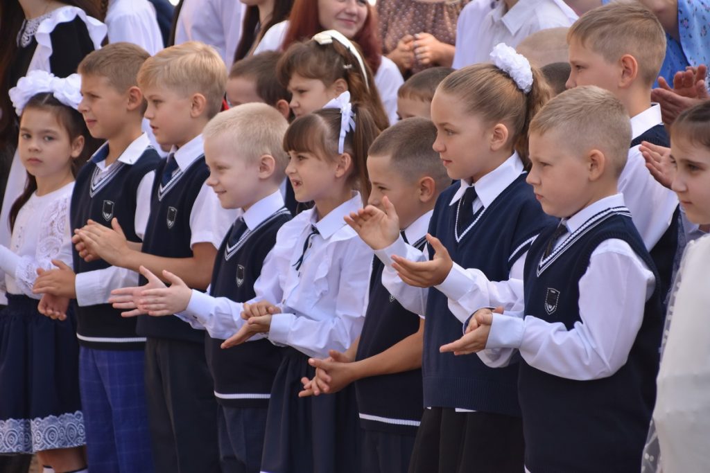 Первый звонок дали ученик одиннадцатого класса Кирилл Рожков и первоклассница Виктория Кныр.