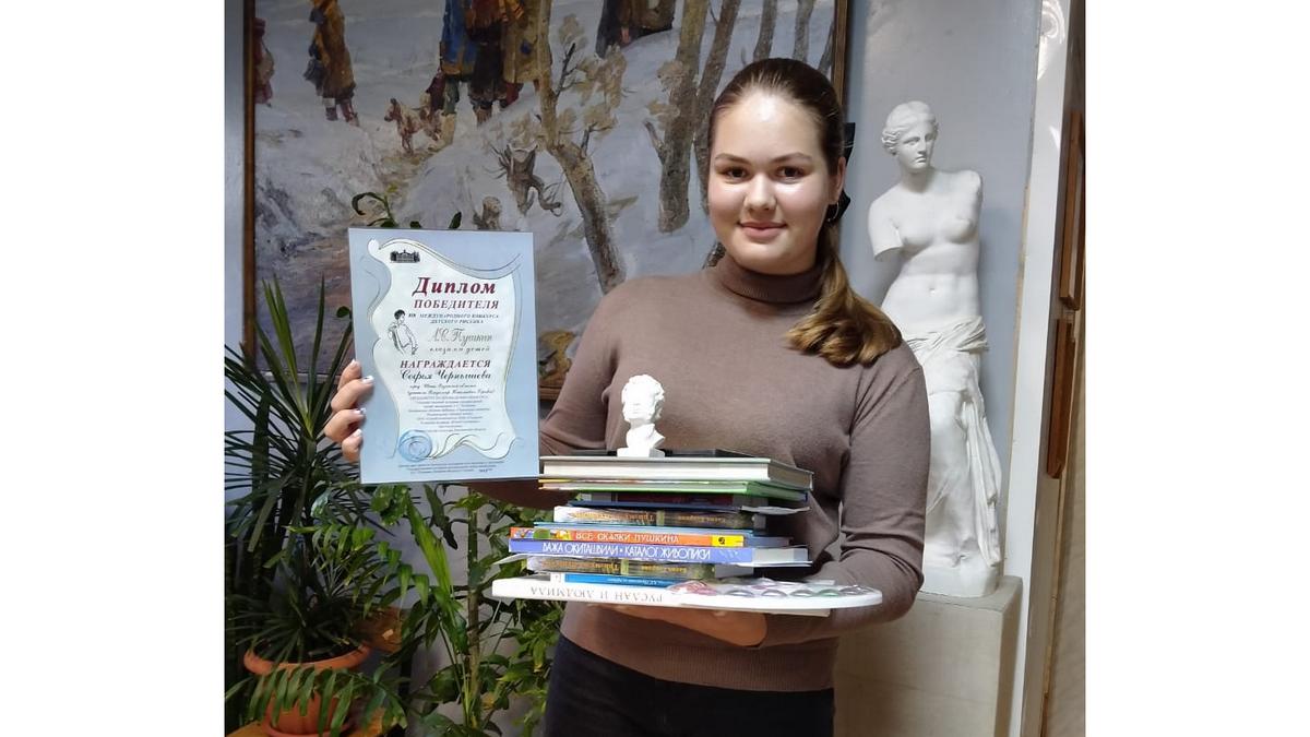 В подарок за победу в конкурсе Софья получила диплом, скульптуру Пушкина и много книг писателя в красивом переплете. Также в течение 2024 года она сможет бесплатно посещать Государственный историко-литературный музей-заповедник А.С.Пушкина.