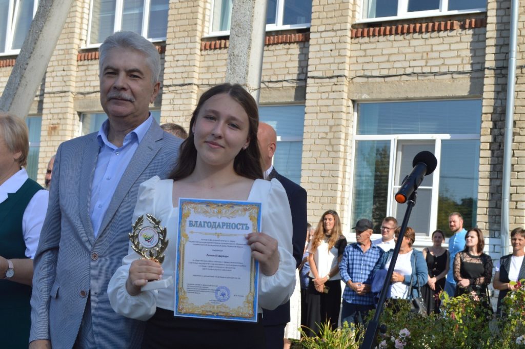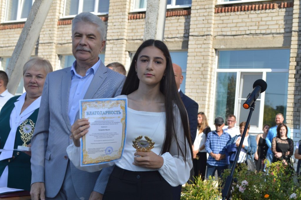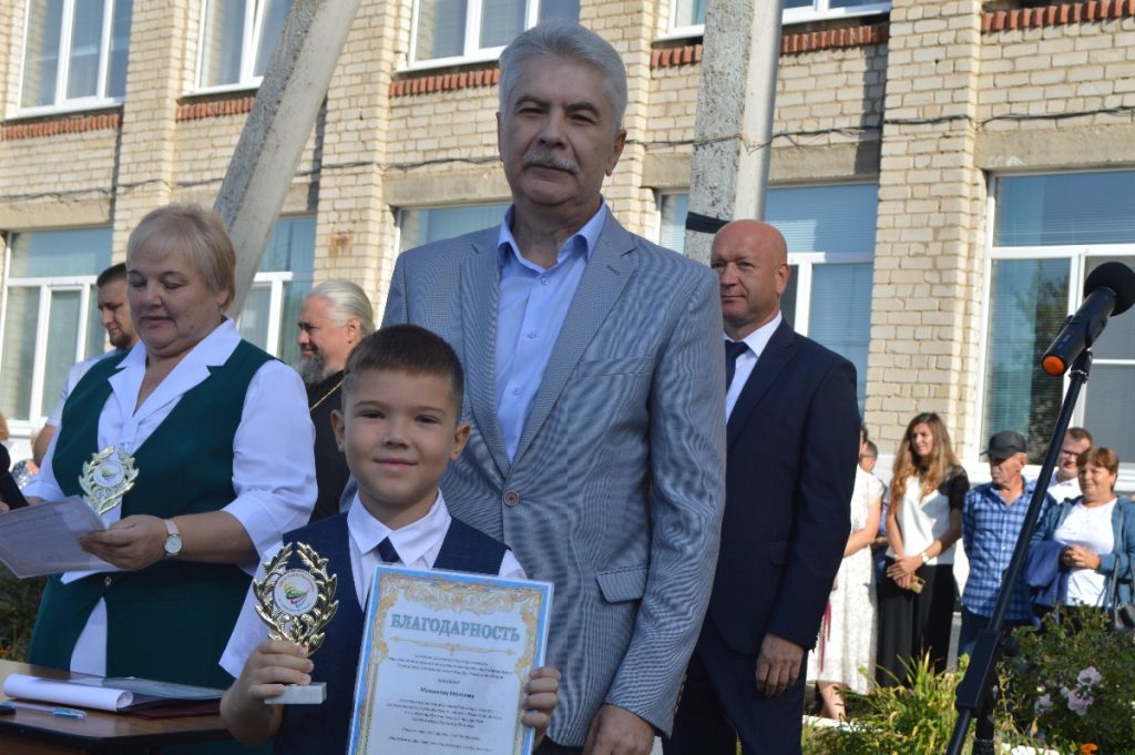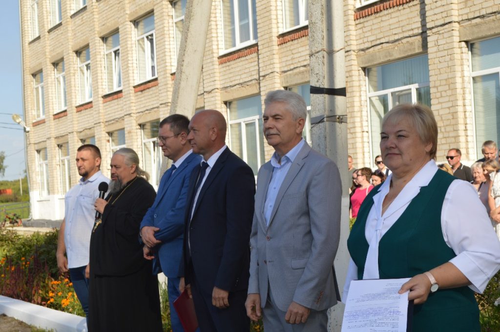 На общешкольной линейке школьников, родителей и педагогов приветствовали председатель областного антикоррупционного комитета Сергей Сорокин, глава администрации района Вадим Рыжков, директор школы Олег Исаев и другие.