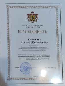 Алексея Евгеньевича по результатам отборочного этапа наградили в номинации «Лучший мастер транспортной сферы». Он вошел в число лучших педагогов, мастеров своего дела Рязанской области. Благодарность ему вручила министр образования Рязанской области Ольга Щетинкина.