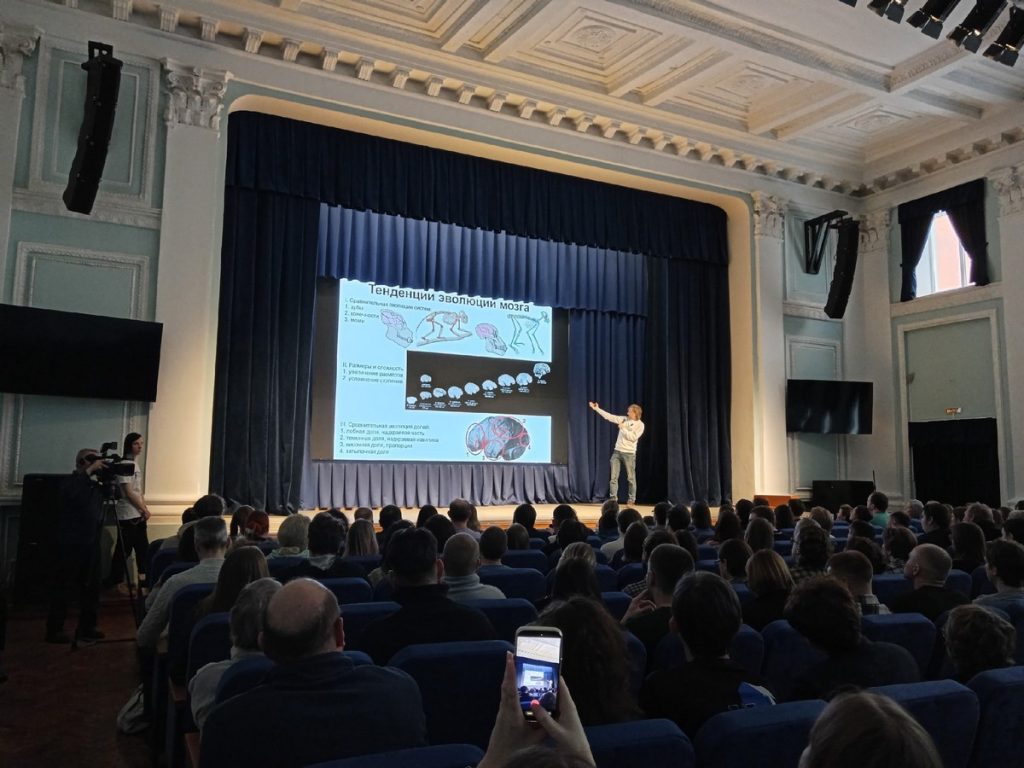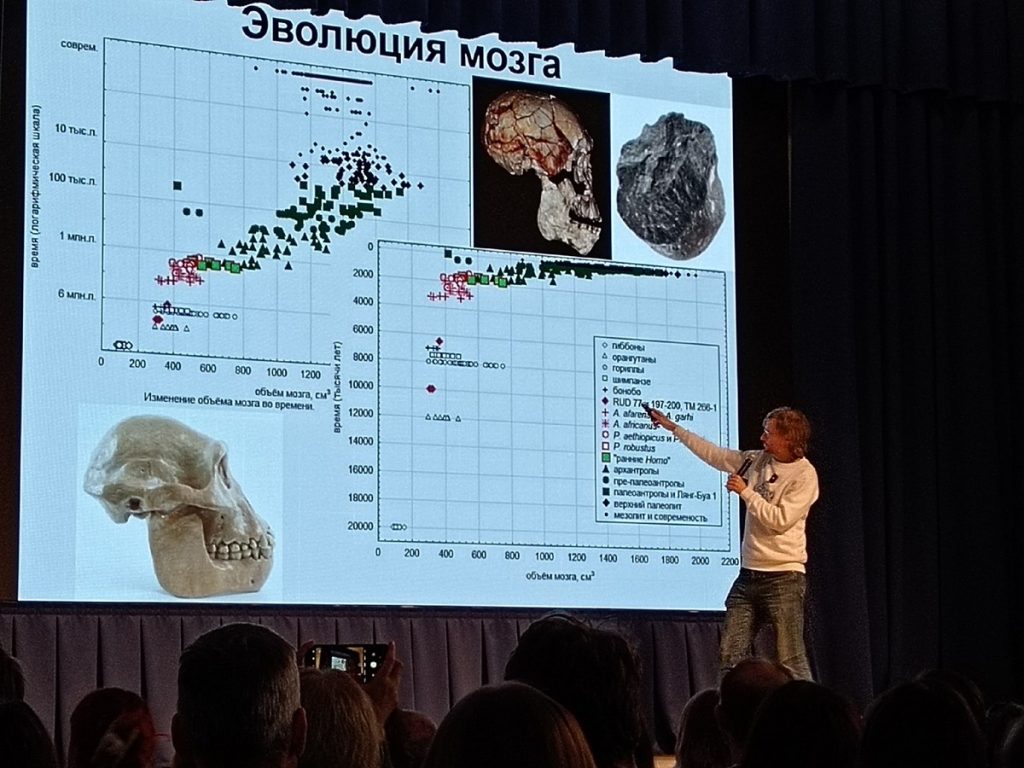 «Эволюция мозга: прошлое и будущее» – так звучала тема лекции в субботу. Дробышевский рассказал о том, как развивался мозг и нервная система у живых организмов – какими, например, были абсолютный вес мозга животных и соотношение его с массой тела (человек и по тому и по другом показателю далеко не чемпион). О том, как на протяжении миллионов лет мозг человека увеличивался, а затем начал уменьшаться – так за последние 25 лет мы потеряли в среднем 150 граммов, но пока не «поглупели». О важности увеличения количества связей между нейронами, развитии «нервной сетки» человека – которую можно потом использовать в любой деятельности. Рассказал об экспериментах на нерожденных детях – они доказывают, что мозг начинает развиваться уже во внутриутробном периоде (например, ребенок запоминает родную речь). Разговор шел и о пищевом поведении – так, например, наша тяга к сладкому и стремление организма запастись жирком – программа, прописанная еще у наших далеких предков.