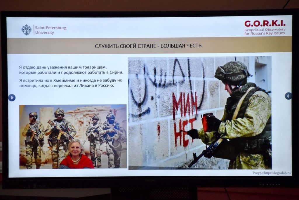 «Я познакомилась с вашими боевыми товарищами на базе Хмеймим, когда приехала из Ливана два года назад. Я их уважаю: они работали и продолжают работать в условиях трудной ситуации. Надеюсь, что в ближайшем будущем ситуация в Сирии изменится в лучшую сторону. В Австрии я также преподавала в военной академии. Для меня это важно, потому что там – практичные люди, которые хотят понять текущую ситуацию и как ее решить».