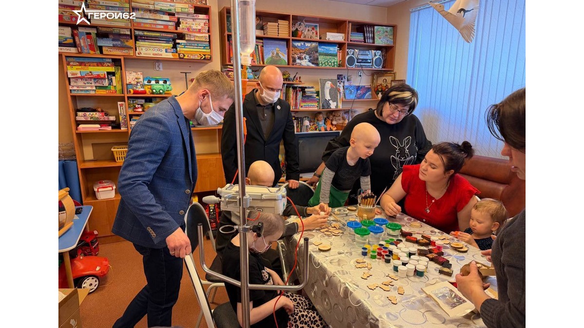 В гости к пациентам в отделение химиотерапии пришли участники проекта «Герои62» Константин Панов и Артур Абелян, а также представители Ассамблеи народов России. Вместе с ребятами они расписали деревянные спилы узорами в стиле народов Севера и подарили им подарки.