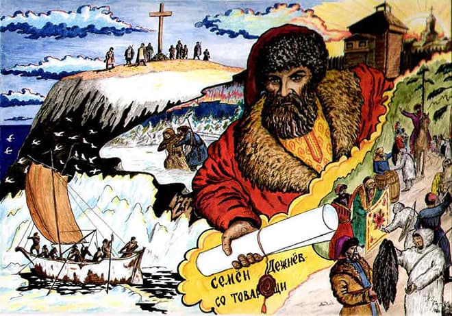 Первым прошел проливом между Ледовитым и Тихим океаном русский человек, казак Семен Дежнёв. Однако его записки надолго затерялись в Якутском архиве (о как это по-русски!) и были обнаружены только Ученым отрядом Великой Северной экспедиции. Зато и западные правительства и адмиралтейства тоже не узнали о походе Дежнёва…