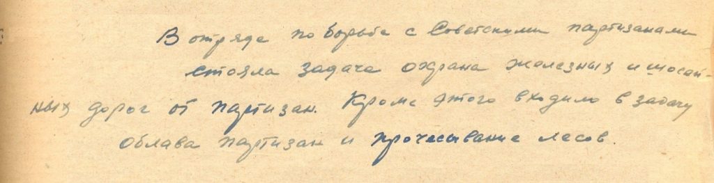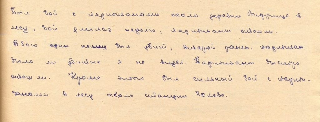 «… В июне 1943 года участвовал в бою против партизан около села Черное Оредежского района Ленинградской области. Во время боя было убито 3 немецких солдата и 4 ранено. Бой длился 2-3- часа, в бою участвовал не один взвод, а много немцев и финнов…».
