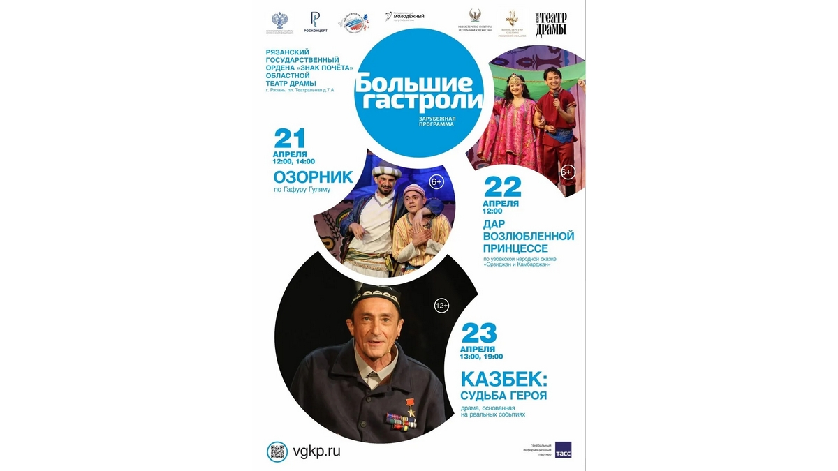 Театр впервые приедет в Рязань. Он покажет спектакли «Озорник» (6+) по Гафуру Гуляму, «Дар возлюбленной принцессе» (6+) по узбекской народной сказке, «Казбек: судьба героя»(12+) — драму, основанную на реальных событиях Великой Отечественной войны.