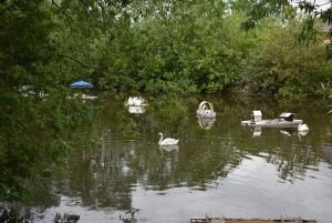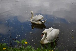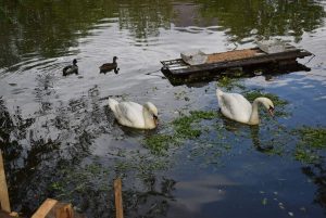 Водоем окружен густой зеленью, в центре пруда – красивые домики для птиц, а по водяной глади грациозно плавают два белоснежных лебедя, рядом с которыми копошатся дикие утки с селезнями.