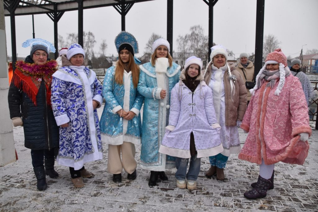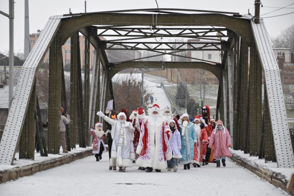 От Михайловского центрального Дома культуры сказочные персонажи прошли через мост архитектуры Антона Бантле по пешеходной зоне, оформленной по мотивам Михайловского кружева, к главной елке округа. В ее украшении тоже использовали элементы Михайловского кружева.