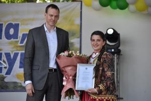 Губернатор вручил диплом лауреату премии имени Александра Аверкина – солистке регионального народного ансамбля «Субботея» Алёне Коротаевой.