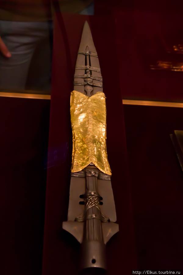 «Святое копье пребывает в Вене по сей день. В его продолговатый, почерневший от времени железный наконечник, покоящийся на выцветшей красной бархатной подушечке в кожаном футляре, вделан кованый железный гвоздь – по преданию, один из голгофских гвоздей. Гвоздь этот вделан в прорезь посредине наконечника, украшенного в нижней части нанесенными по обе стороны от втулки двумя золотыми Андреевскими крестиками, и дополнительно закреплен при помощи манжетки, обмотанной металлической (золотой, серебряной и медной) проволокой. В ходе бурной истории Святого копья его наконечник оказался переломленным пополам и с тех пор его острие соединено с нижней частью наконечника другой, серебряной, манжеткой, которой довольно-таки неуклюжие руки древнего мастера попытались придать очертания сложенных голубиных крыльев».