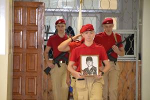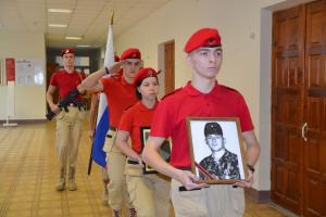 По звонку ученики школы выстроилась в коридорах. Знаменная группа юнармейцев пронесла портреты Героев по школе. Ученик 6 класса Арсений Черкалин прочитал стихотворение «К бессмертному подвигу…».