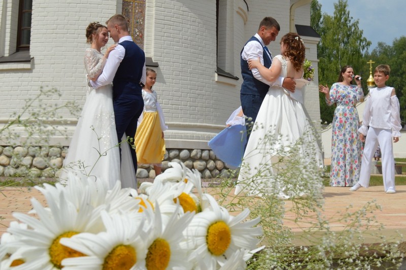 По традиции в день благоверных Петра и Февронья у храма в их честь проходит выездная регистрация брака. В этом году под сенью святых браком сочетались Владислав и Алёна Дрогожиловы и Евгений и Наталья Фигуровские. Под аплодисменты собравшихся молодожены обменялись кольцами.