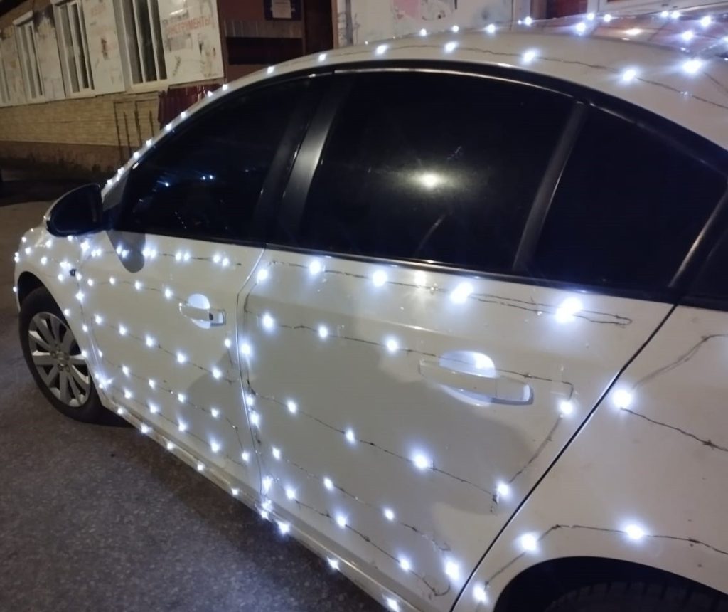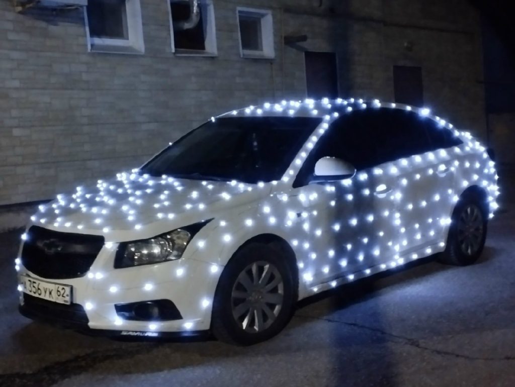 В новогоднюю ночь на дорогах в пронском селе Октябрьское можно встретить светящийся автомобиль. Молодой агроном местного сельхозпредприятия Вадим Зайцев уже второй год украшает свой белоснежный Chevrolet светодиодными огоньками. В этот раз он использовал стометровую гирлянду.