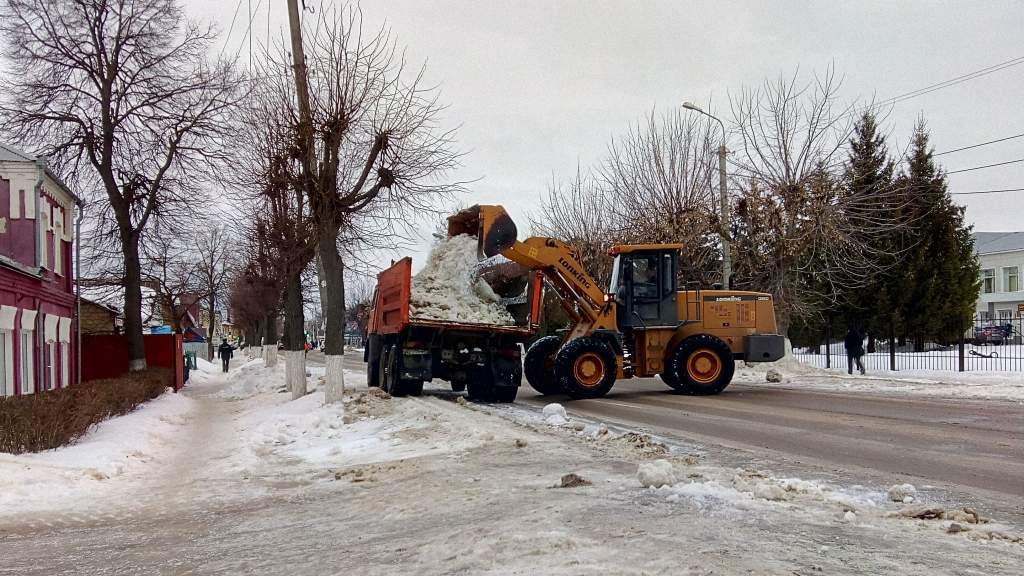 Три машины и погрузчик вывозят снег с улиц Шацка