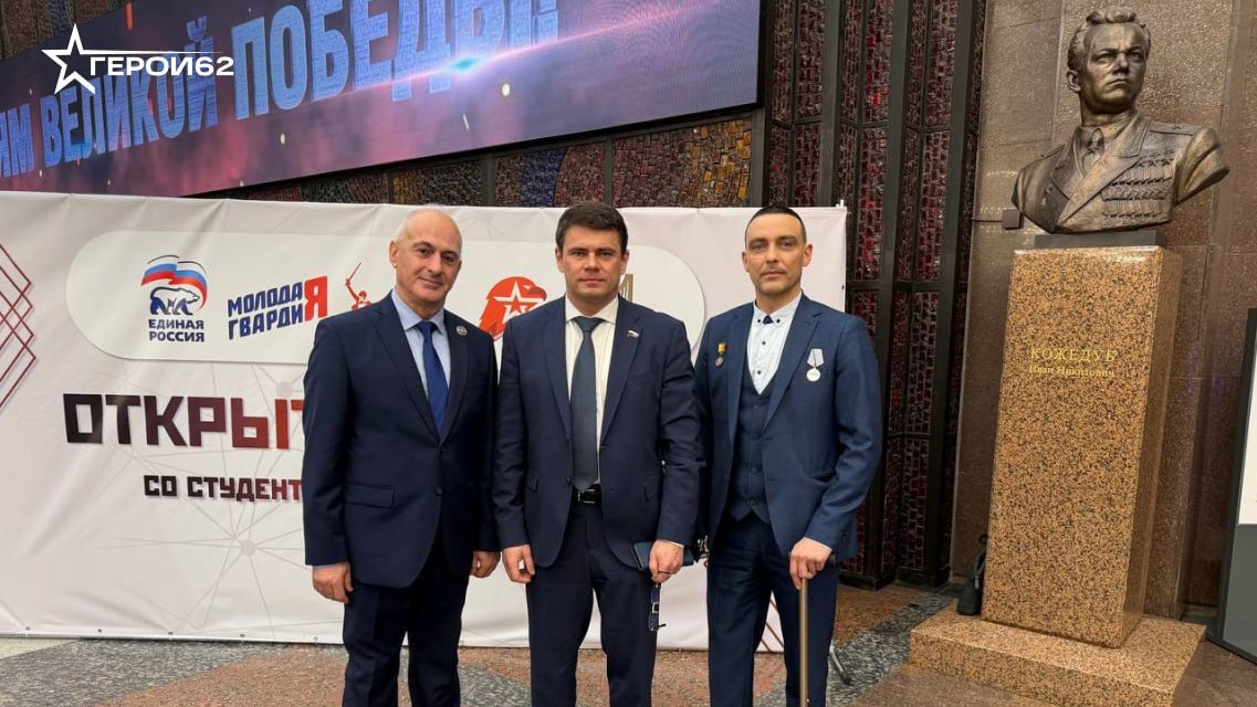 В преддверии Дня российского студенчества в Музее Победы на Поклонной горе Молодая Гвардия организовала встречу с участием более 150 студентов. Темой встречи стали вопросы помощи студентам, вернувшимся с фронта. Рязанскую область на мероприятии представили участники региональной кадровой программы «Герои62», ветераны спецоперации Артур Абелян и Петр Рябов.