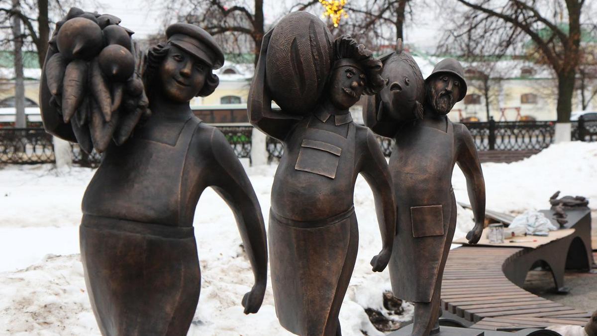 Бронзовые лавочники, каждый со своим товаром, мешки с колосьями, воробьи и самый настоящий Екатерининский рубль – территорию Торговых рядов украшают новые скульптуры. Рядом с арт-объектами разместили скамейки для отдыха и люк с надписью: «У нас в Рязани и пироги с глазами».