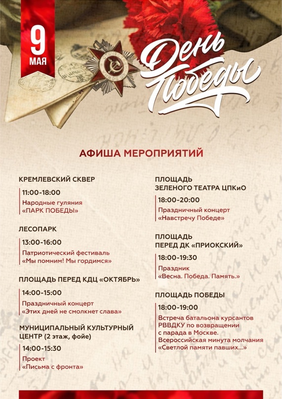 18.00–19.30 площадь перед ДК «Приокский», праздник «Весна. Победа. Память»;