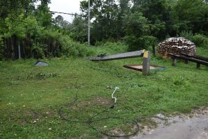 10 июля в Ермиши ураганный ветер с дождем сломал старое дерево в Речном переулке. Оно упало на линию электропередач.