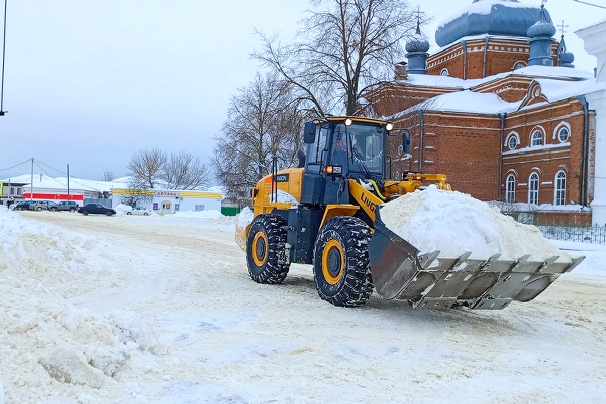 Снег убирает техника индивидуального предпринимателя «А.А. Богдашкин». На улицах Кадома работают погрузчик, два КамАЗа и трактор.
