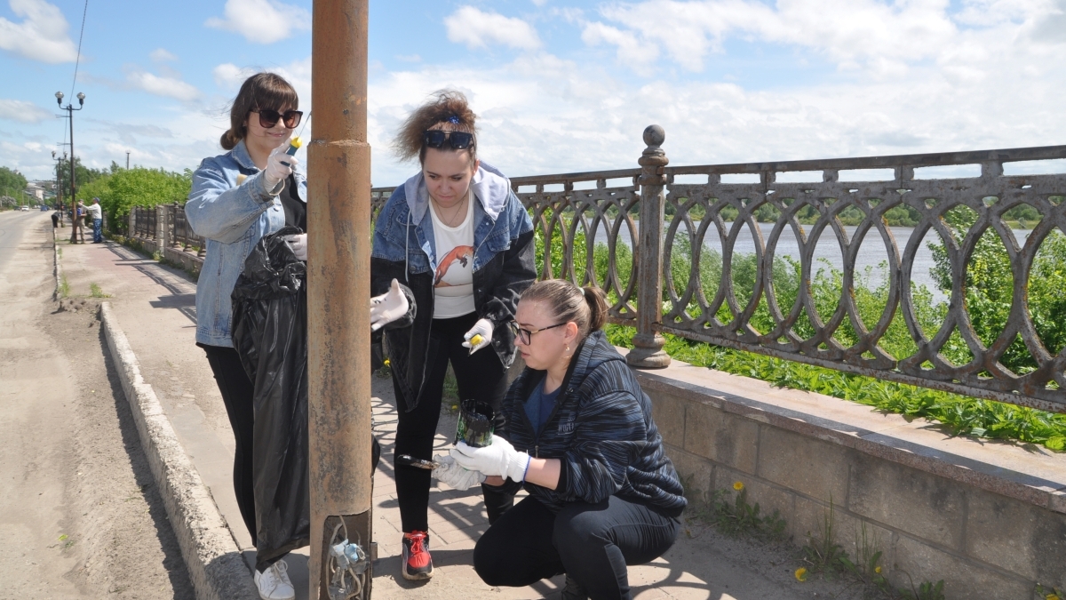 Специалистам сектора молодежной политики управления образования горадминистрации Татьяне Громовой, Валерии Бирмилеевой и Яне Кацмаер достался участок по зачистке и покраске столбов уличного освещения.