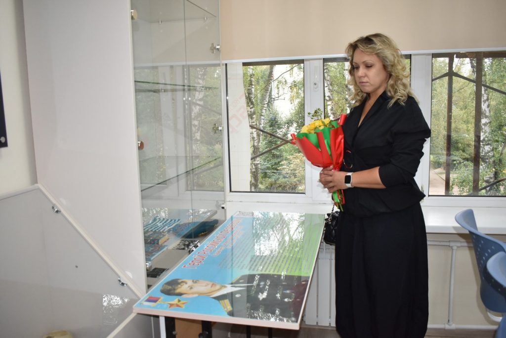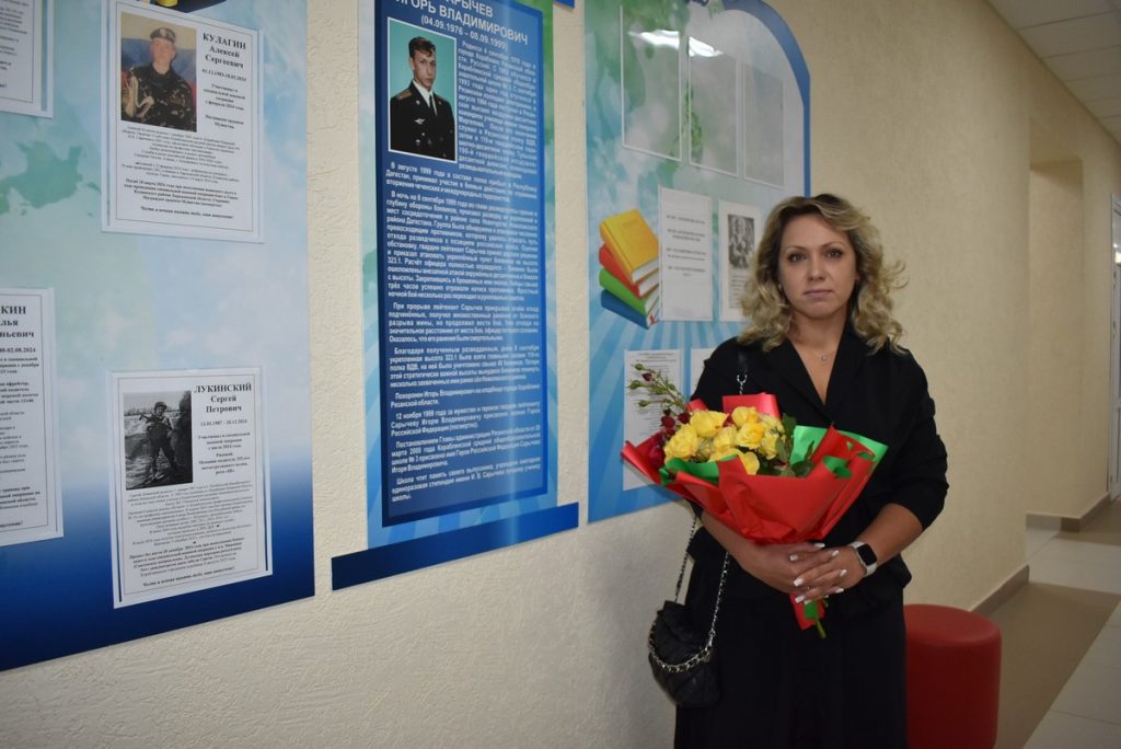 Для вдовы Игоря Сарычева Кристины провели экскурсию по обновленной школе. Особенно запомнились ей стенд на первом этаже, посвященный герою, и музей Игоря в одном из школьных кабинетов.