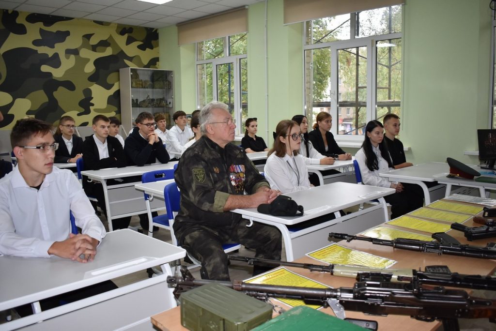 На Уроке мужества перед старшеклассниками выступили приехавшие в школу помощник заместителя начальника управления Росгвардии по Рязанской области, капитан Алексей Бакушин и председатель совета ветеранов Росгвардии Рязанской области Олег Лагуткин.