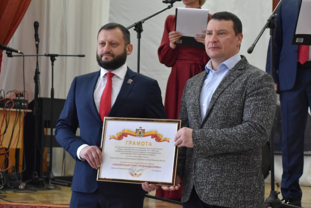 Депутат Рязанской областной Думы Владислав Фролов вручил руководителю инициативной группы Татьяне Шалыгиной грамоту, свидетельствующую о присвоении почетного звания поселку.