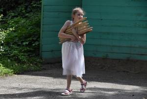 Взрослые и дети пробовали разбить «пушку», «ракету», «звезду» и другие фигуры из рюх (небольшие деревянные чурки для игры в городки. – Прим. редакции) с помощью особых бит.