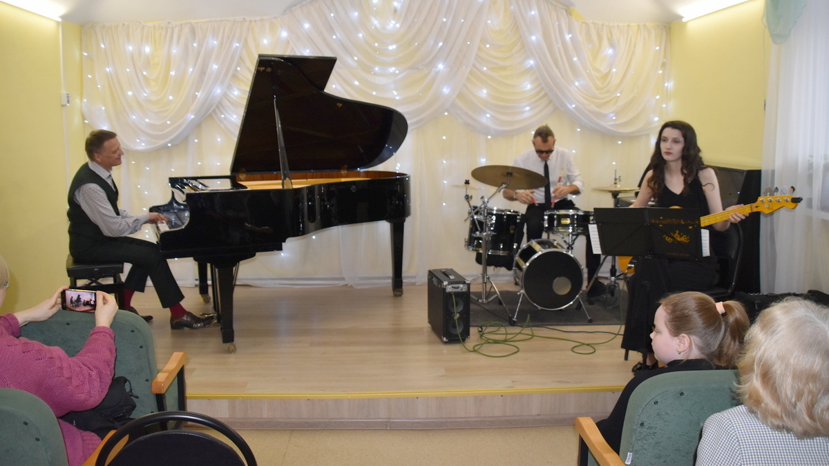 На сцене музыкалки выступило трио Геннадия Филина в составе: Геннадий Филин (руководитель коллектива, фортепиано), Вячеслав Сергеев (барабаны), Полина Середа (бас-гитара).