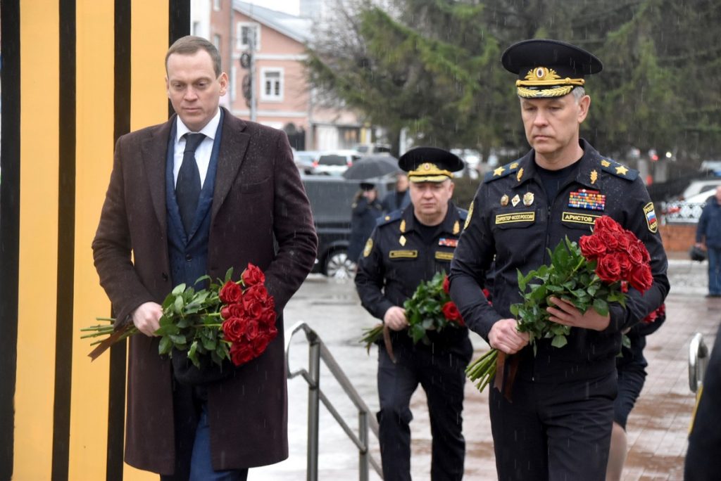 Цветы к памятнику воинам, погибшим в локальных конфликтах, возложили губернатор Рязанской области Павел Малков и директор Федеральной службы судебных приставов Дмитрий Аристов.
