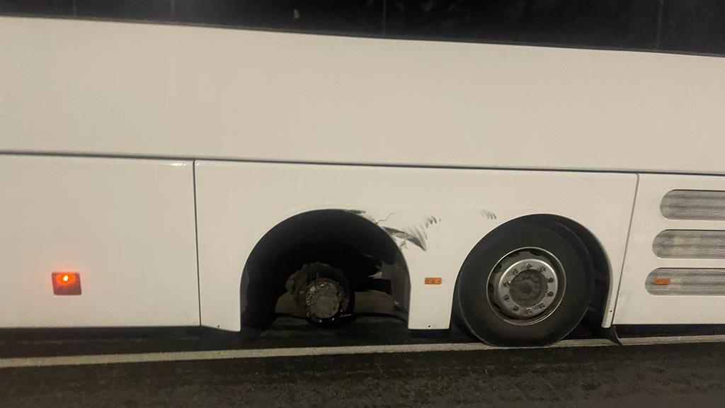 Выяснилось, что у автобуса с 56 пассажирами во время движения открутилась ступица и отлетело заднее колесо. Водитель остановился на трассе с включенной аварийкой.