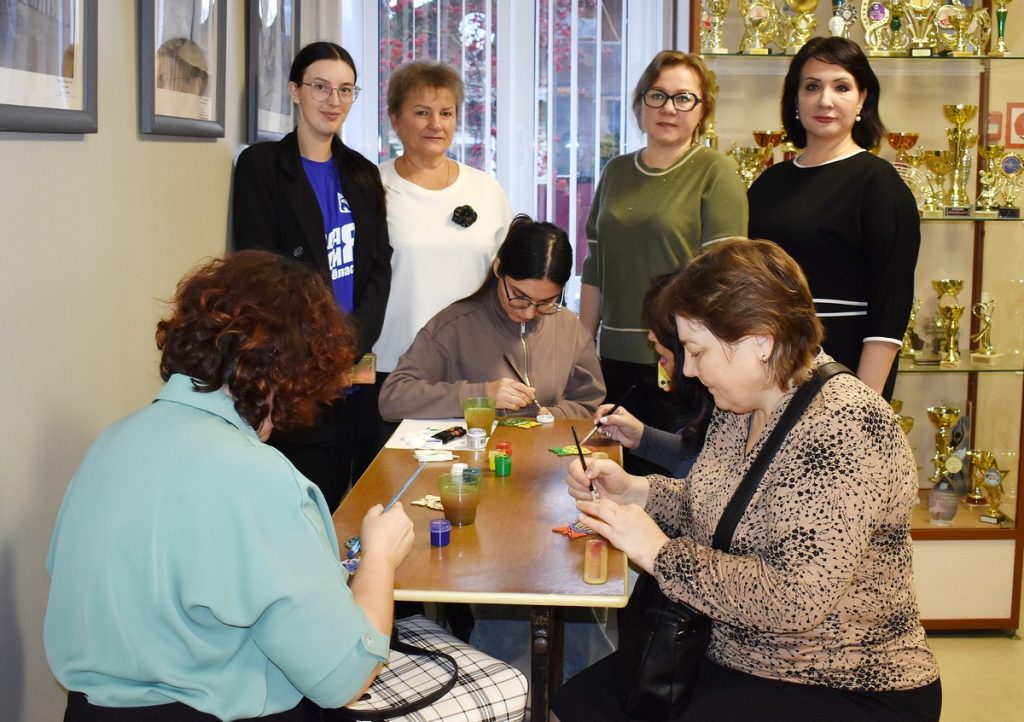 В фойе прошли мастер-классы от «Молодой гвардии» и «Движения первых», на которых можно было сделать на память новогоднюю деревянную игрушку или открытку «Любимые цветы».