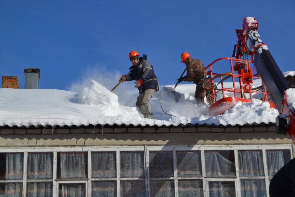 В среду крышу с помощью спецтехники начали расчищать от снега.