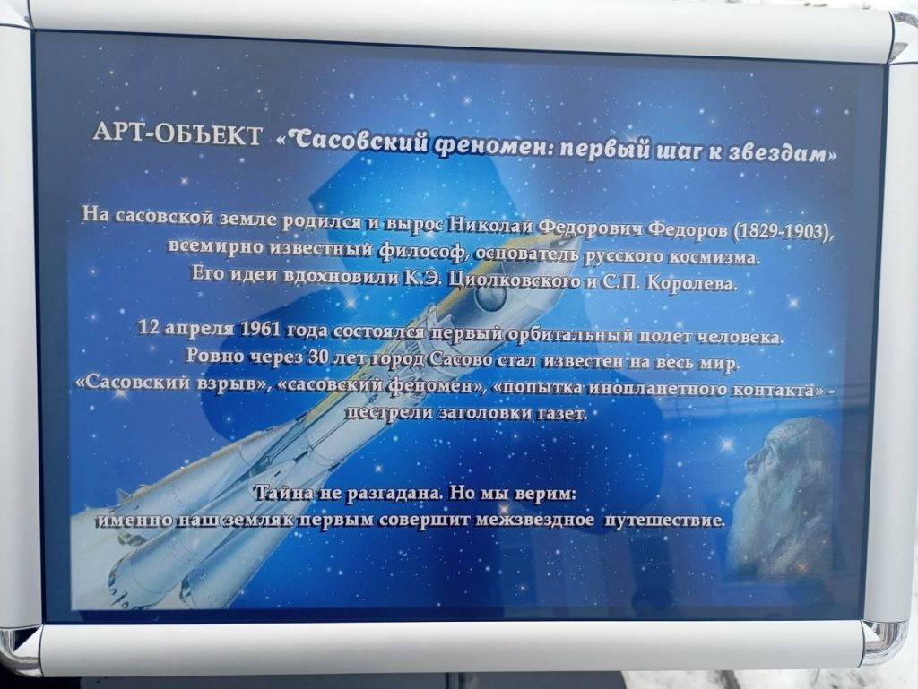 «Очевидцы сообщают, что был сильный хлопок и гул, у многих даже разбились стекла в домах. Так что же это было? Версий несколько. Но самой загадочной является версия о вмешательстве инопланетян! Остается только размышлять и догадываться. Перед открытием мы провели тревел-программу «Тропою сасовского пришельца», посвященную нашему земляку, основателю русского космизма Николаю Федоровичу Федорову. А затем сбросили черные покрывала со скульптур и представили на суд жителей арт-объект».
