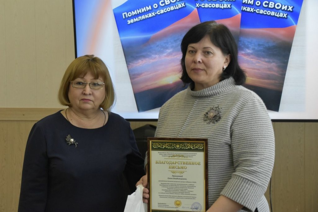 13 февраля в сасовской Центральной библиотеке состоялась презентация первой части книги памяти «Помним о СВОих земляках-сасовцах». Ее подготовили по инициативе Совета ветеранов Сасовского округа и сасовской Центральной библиотеки на средства гранта, который выделили в ходе конкурсного отбора некоммерческих организаций на получение субсидий из местного бюджета. Большое содействие в создании книги оказала администрация округа. Собрать информацию о бойцах помогли их родственники, друзья, а также организации.