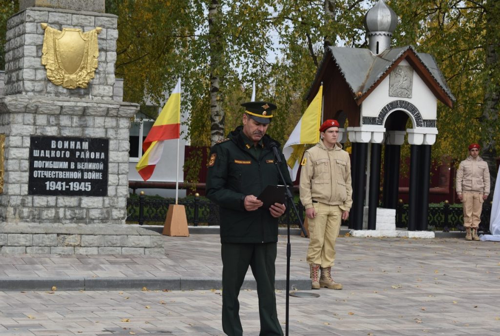 Собрались шатчане, представители власти и неравнодушные жители, чтобы почтить память героев. Право открыть памятник предоставили и.о. главы администрации Шацкого района Алексею Яныкину и депутату Рязанской областной Думы Владимиру Материкину. Настоятель Успенской Церкви города Шацка протоиерей Вячеслав Бузынин провел чин освящения.