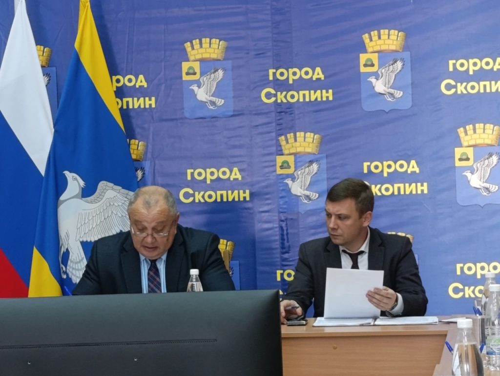 Начальник юридического отдела администрации Скопина Людмила Немых доложила, что на первом заседании Думы Скопинского муниципального округа поручила юридическому отделу администрации Скопина провести мероприятия по разработке официальной символики Скопинского муниципального округа. Символику разработал заместитель председателя постоянной комиссии Геральдического совета при президенте Российской Федерации по вопросам региональной и муниципальной геральдике, заместитель председателя Геральдического совета Михаил Шелковенко. По рекомендации геральдического совета оставили исторический образ герба, флаг немного изменили.