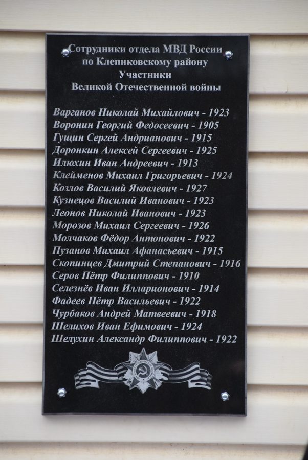 В преддверии Дня полиции в Спас-Клепиках открыли мемориальную доску, посвященную землякам, сотрудникам отдела внутренних дел, которые прошли Великую Отечественную войну. На доску занесено 19 имен. На торжество пришли сотрудники полиции, ветераны службы, представители власти и местные жители.