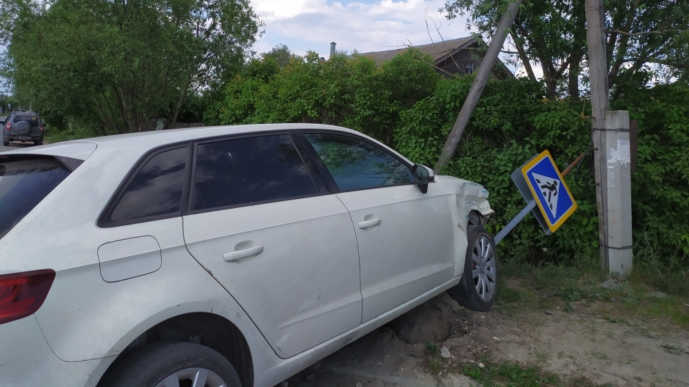 От удара при столкновении Audi отскочила и врезалась в столб с дорожным знаком. В аварии никто не пострадал, прибывшие на место ДТП инспекторы ГИБДД устанавливают виновника аварии.