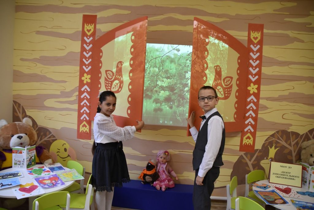 Есть в новой библиотеке даже «Комната сказок» – творческое пространство для детей. Кроме детской мебели-конструктора здесь есть расписанная стена-картина, разрисованная персонажами сказок. А еще есть экран для показа мультфильмов и диафильмов с декорированными створками.