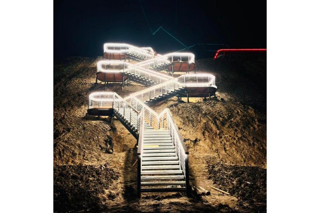 На первой площадке – за зданием Центра дополнительного образования – пустырь превратили в благоустроенное городское пространство. На входе установили арку в виде изгиба реки. Над холмом установили смотровую площадку «Небесный балкон» с лавочками, откуда открывается прекрасный вид на спасские просторы. Рядом с балконом установили лестницу, ведущую к берегу Спасского затона, которая сама по себе стала одним из арт-объектов площадки, особенно в ночное время. И смотровую площадку, и лестницу оборудовали подсветкой.