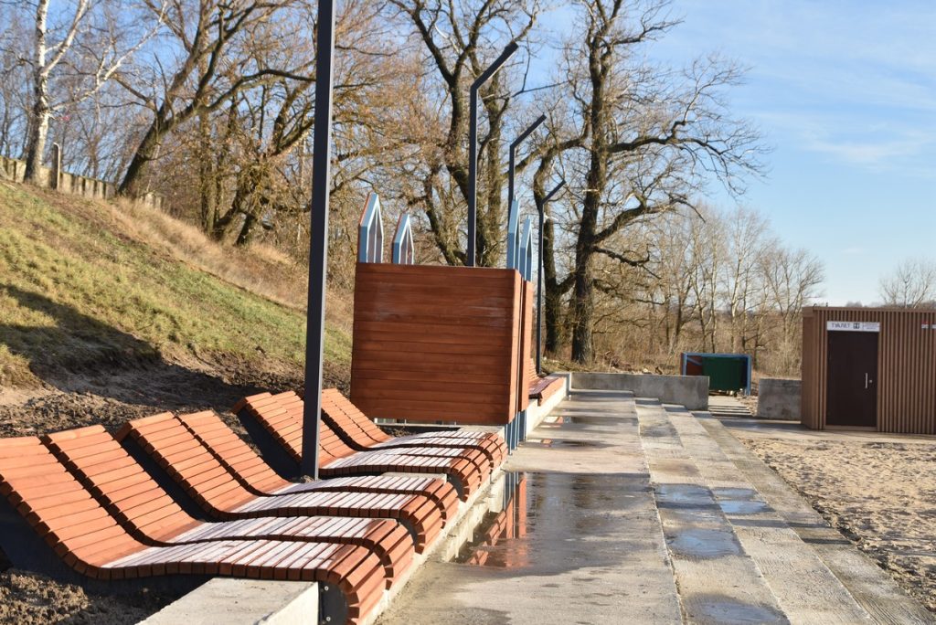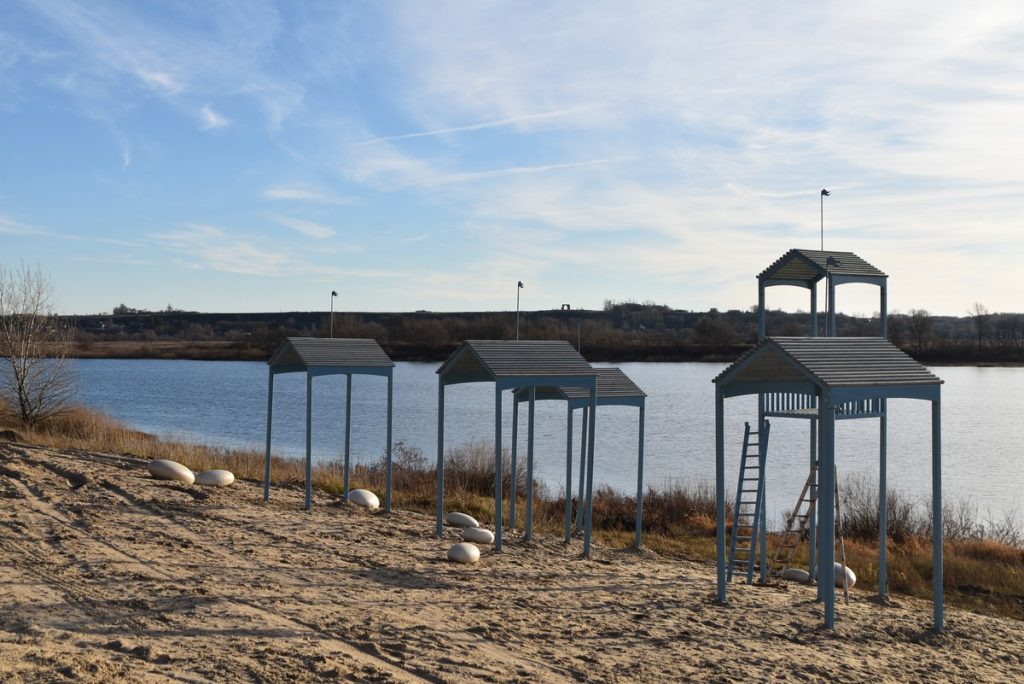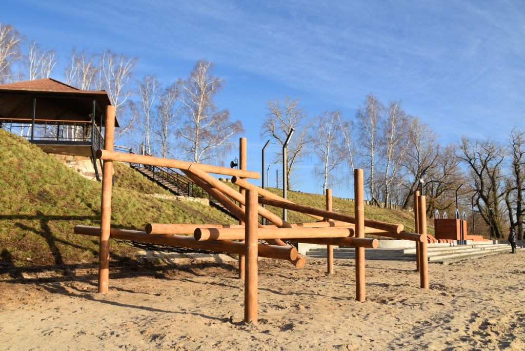 Внизу площадки, на месте «солдатского» пляжа, оборудовали солнцезащитные сооружения – перголы. Установили сиденья и лежаки, раздевалки и туалет, основание под них специально подняли и залили бетоном, чтобы избежать возможного подтопления в весенний разлив.