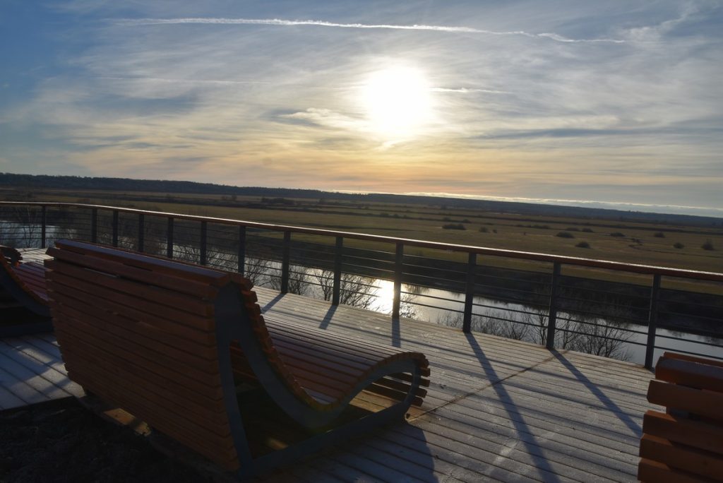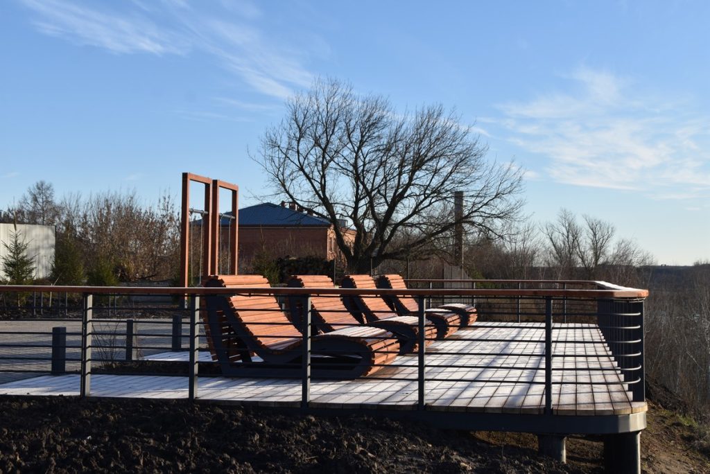 На месте уже существующей смотровой площадки «Пристань Великая река» тоже провели благоустройство. Обновили дорожки, провели новое освещение, высадили деревья и кустарники, установили скамейки и качели.