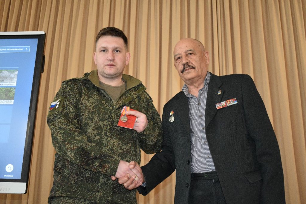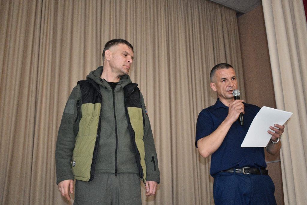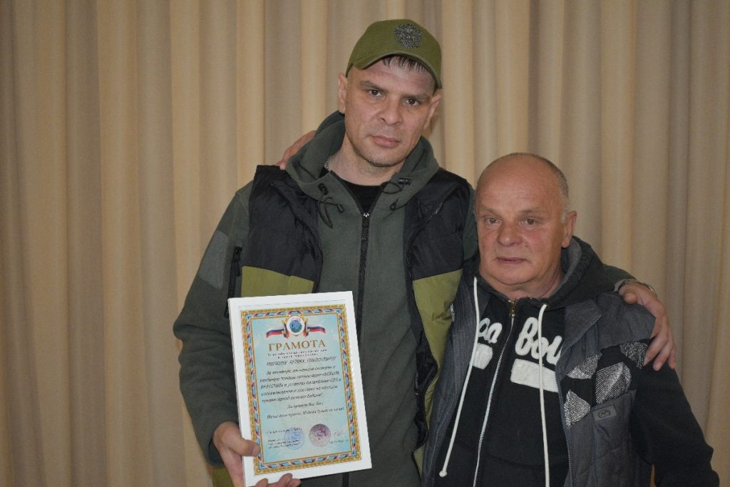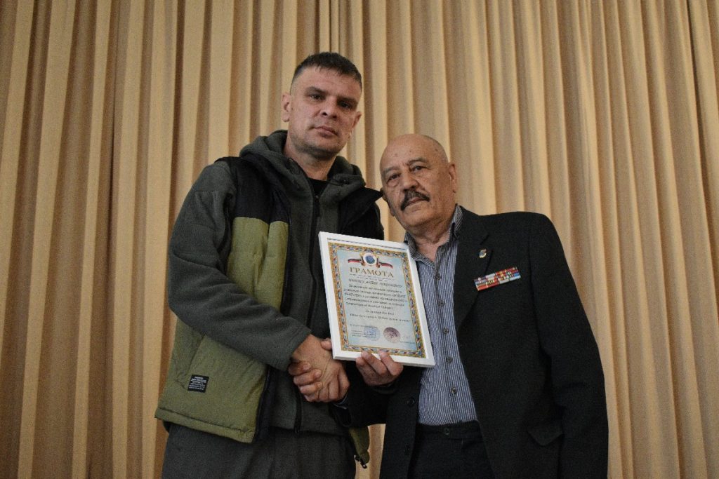 Председатель местного отделения «Боевого братства» Борис Сайфутдинов также поблагодарил всех за гуманитарную поддержку участников СВО. Он вручил «Физруку» медаль «100 лет Вооруженным Силам России» и почетную грамоту бойцу с позывным «Миныч».