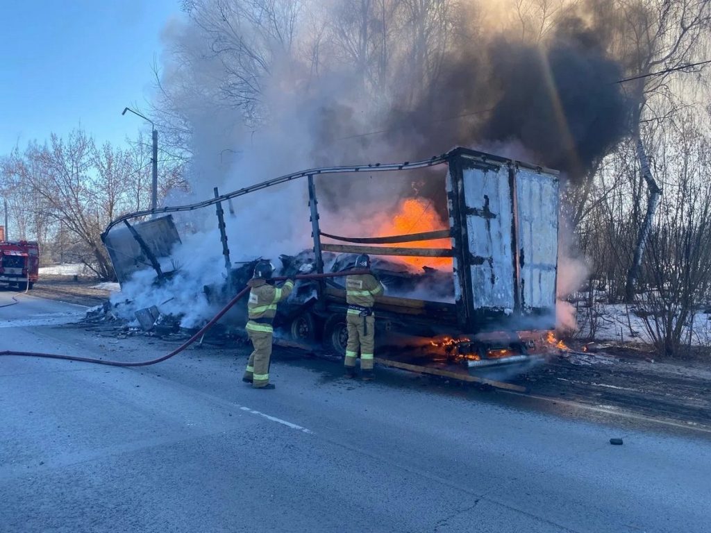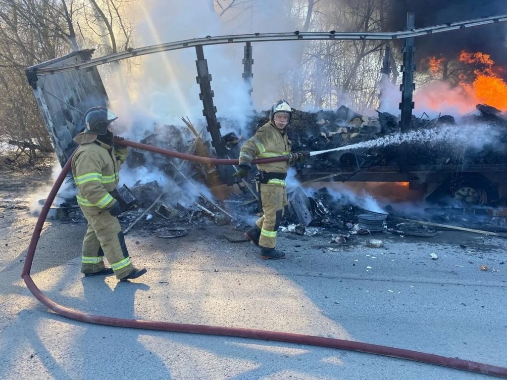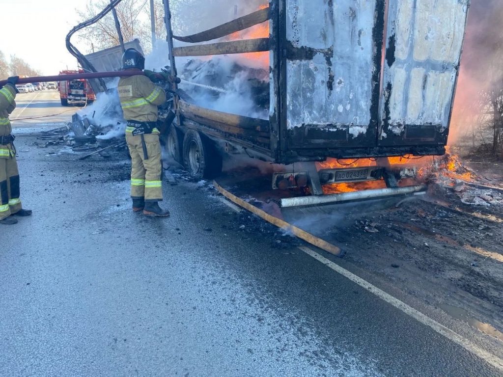 Огонь уничтожил полуприцеп и груз. Общая площадь пожара – 35 квадратных метров.