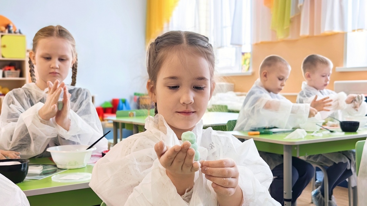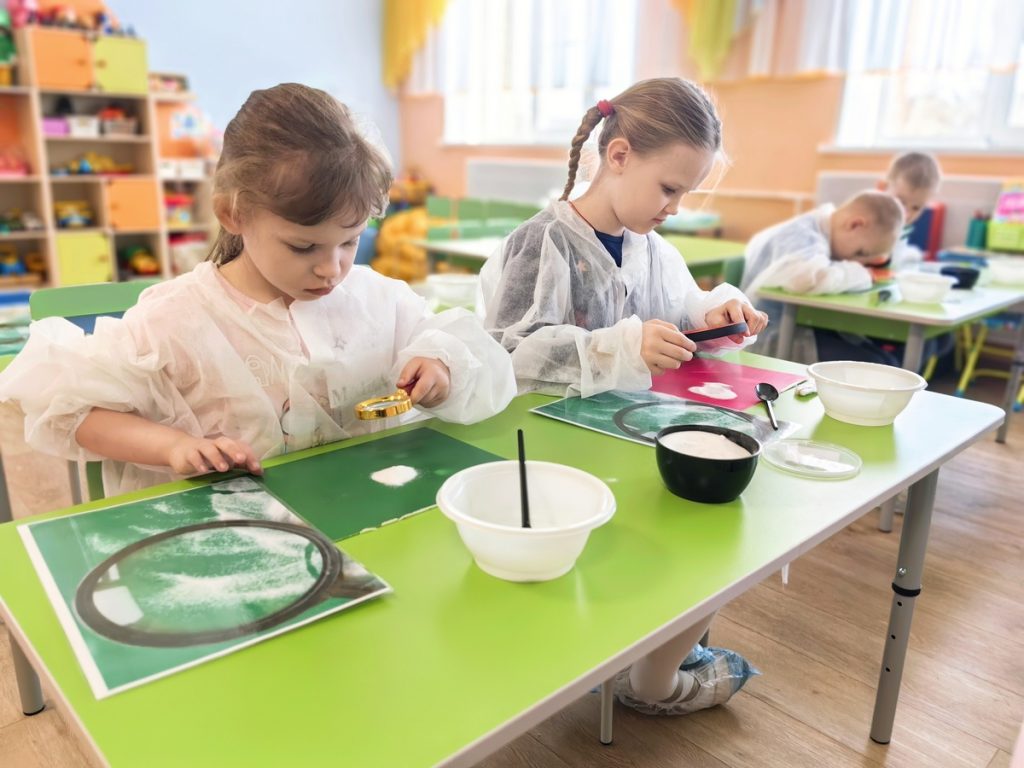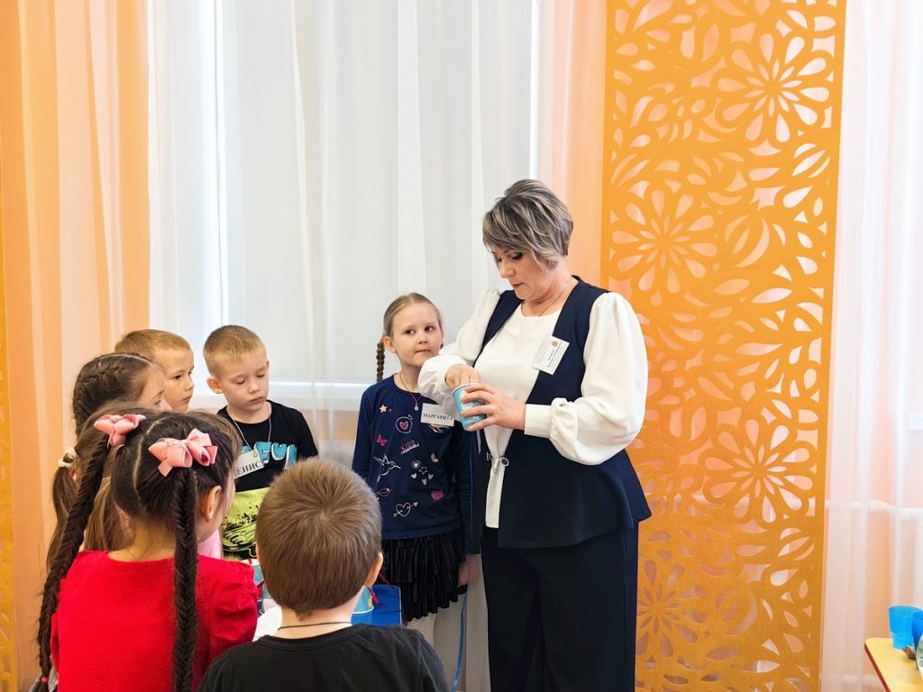 Третье место заняла Алина Ильясова. Она увлекла детей подготовительной группы лабораторными исследованиями. Дети надели бахилы и белые халаты, рассматривали под увеличительным стеклом кристаллики соды.