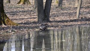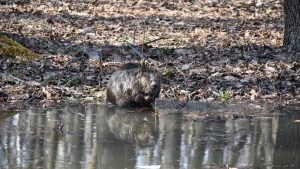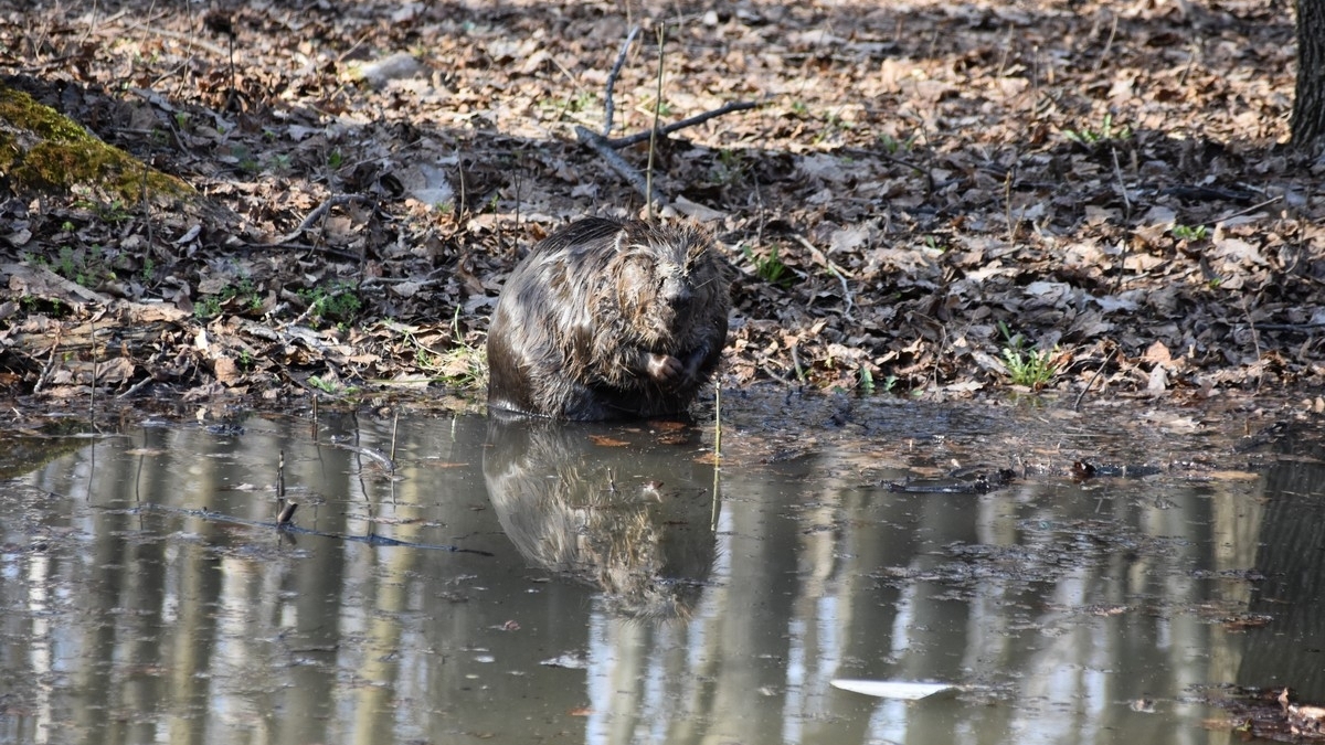 Судя по всему, при отсутствии посетителей Лесопарка, территория которого подтоплена, бобер чувствует себя отлично.
