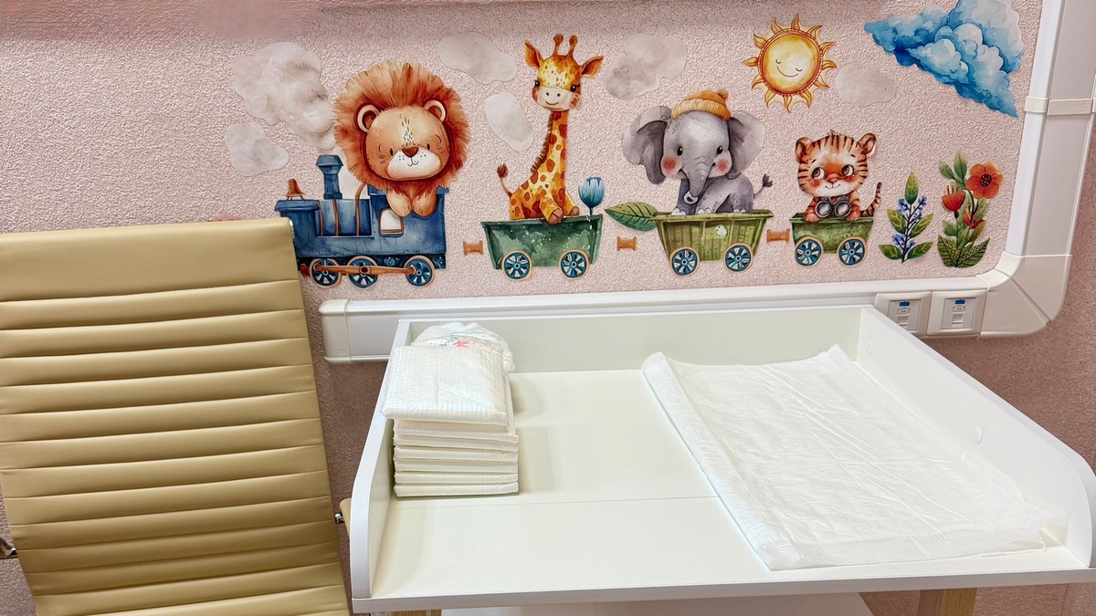 В комнате есть пеленальный столик, гигиенические принадлежности, место для кормления. Здесь можно переодеть или покормить ребенка в ожидании приема.