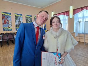 Председатель участковой избирательной комиссии Ирина Парфенова поздравила молодоженов со знаменательным событием и вручила Алене диплом впервые голосующего и подарок.