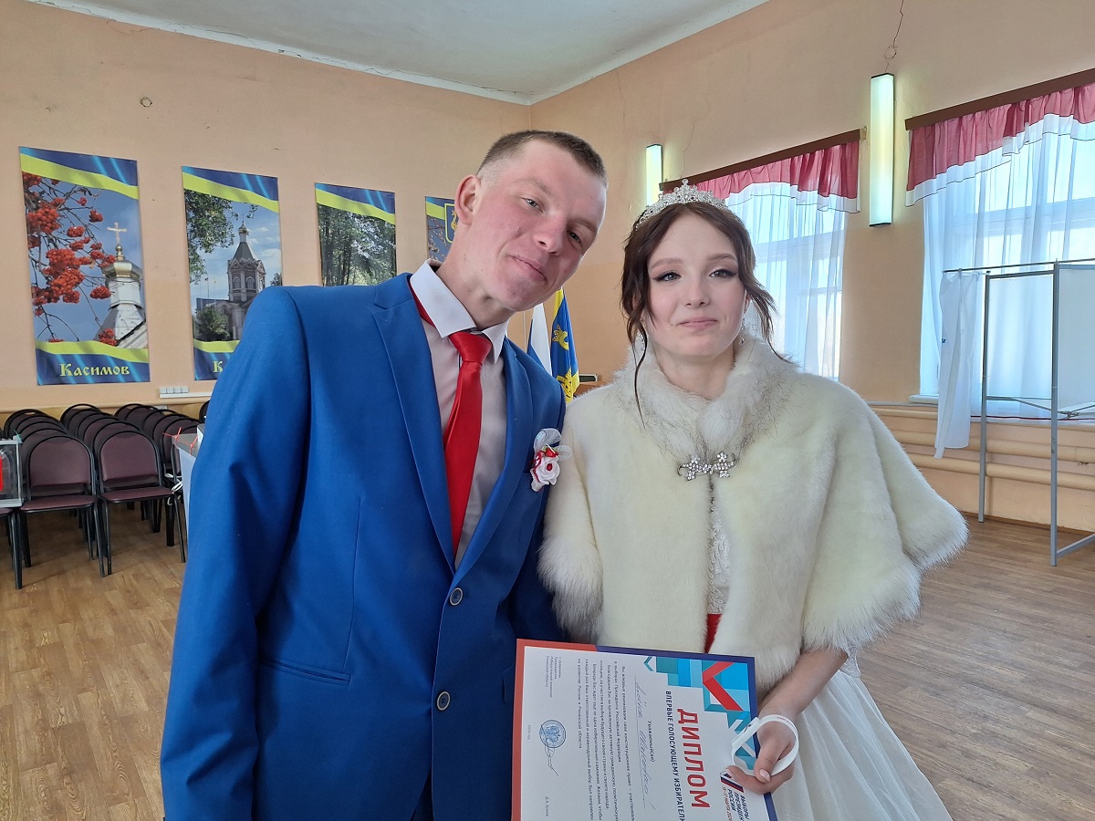 «Я уже некоторое время живу в Меленках, откуда родом мой муж Егор. Расписываться мы решили в Касимове. Ну и так как после свадьбы вновь уеду, то решила, что надо проголосовать».